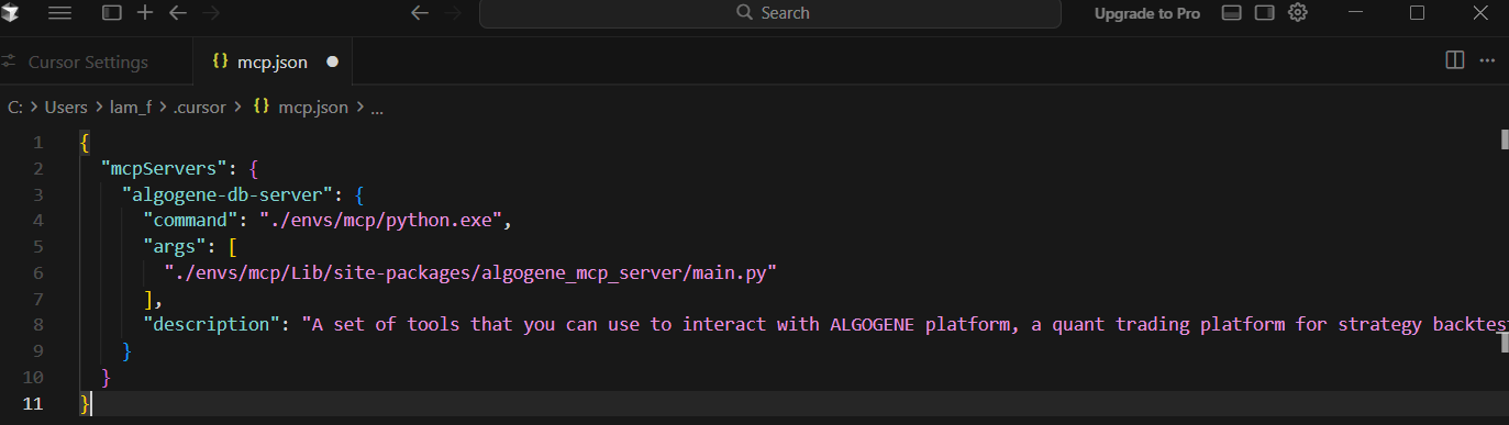 • Add "algogene-db-server" to "mcp.json" on Cursor as below. Remind to update "command" and "args" to your python installation path